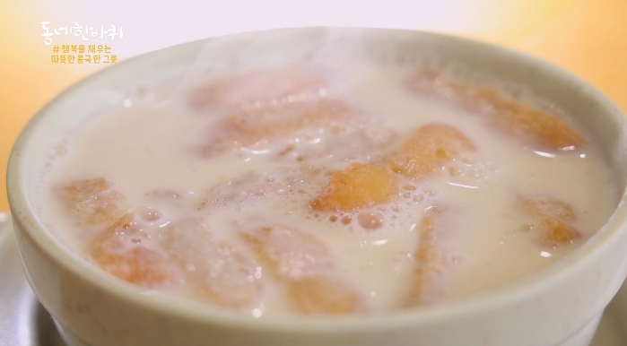 찹쌀도넛이 들어간 콩국은 마치 수프같아 보이네요.