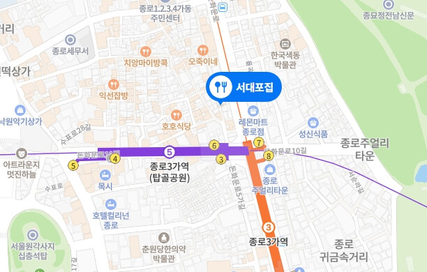지하철 이용 시, 1호선, 3호선 5호선 종로3가역 6번 출구에서 약 80m에 위치해 있어요.