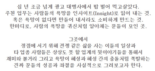 광고대행사는 밖에서 보면 화려하고 우아해보이지만, 뒷면에서 현재 일하는 현장은 살아남기 위해 발버둥치는데 이러한 일상을 보여줄 예정이라고 합니다.