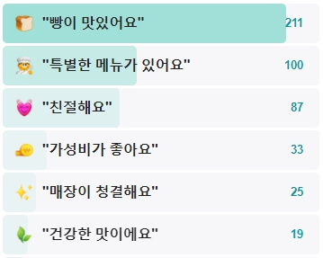 등록된 평가를 보면, '빵이 맛있어요, 특별한 메뉴가 있어요, 친절해요, 가성비가 좋아요, 매장이 청결해요, 건강한 맛이에요' 등의 평가가 잇따르고 있었습니다.