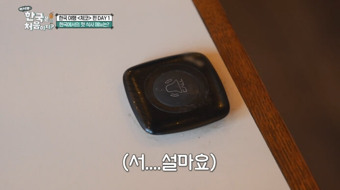 이번에는 테이블 위에 있는 진동벨의 용도를 궁금해하다 눌러보고는 종업원이 오는 것을 보고 놀라워했어요.