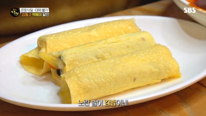 다른 집 계란김밥과 다른 것이 이곳은 계란 지단을 80% 정도만 익히기 때문에 계란 지단이 부드러운 것이 특징이랍니다.